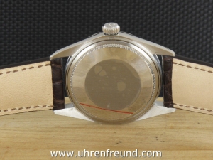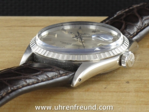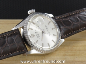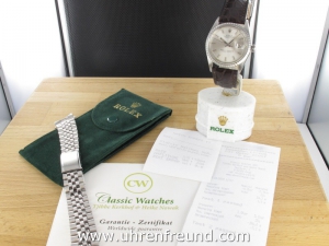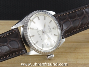Original Oyster Perpetual Datejust Ref. 1603 mit Zifferblatt in silber und geriffelter Stahllünette aus dem Jahr I 1969. Das Gehäuse und Plexiglas befinden sich in sehr gutem Zustand und weisen beinah keine Gebrauchsspuren auf. An der Uhr befindet sich ein braunes Alligator Lederband welches neu und ungetragen ist. Das original Jubilèband wird mitgeliefert und kann gegebenenfalls auch getragen werden. Das Automatik Uhrwerk ist überholt, kontrolliert und läuft einwandfrei. Bei der Uhr handelt es sich um das Herrenmodell mit einem Durchmesser von 36 mm, welches auch sehr gerne von Damen getragen wird. Der Rolex Klassiker schlechhin! Die Lieferung erfolgt mit Serviceetui, Rechnung von Classic Watches und CW-Garantiezertifikat.