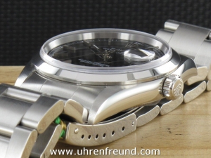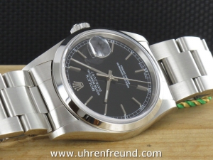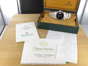 Rolex Datejust 36mm ref. 16200 mit schwarzem Zifferblatt aus 2001 mit Verkaufsdatum 27.05.2002. Die Uhr befindet sich im Orginalzustand. Das Gehäuse, Saphirglas und Oysterband befinden sich in sehr gutem Zustand und weisen nahezu keine Gebrauchsspuren auf. Das Automatik Uhrwerk ist überholt, kontrolliert und läuft einwandfrei. Bei der Uhr handelt es sich um die Herrengrösse mit einem Durchmesser von 36 mm, welche auch gerne von Damen gertagen wird. Die Lieferung erfolgt mit Box, Originalzertifikat, Rechnung von Classic Watches und CW Garantiezertifikat.