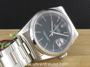 Rolex Datejust 36mm ref. 16200 mit schwarzem Zifferblatt aus 2001 mit Verkaufsdatum 27.05.2002. Die Uhr befindet sich im Orginalzustand. Das Gehäuse, Saphirglas und Oysterband befinden sich in sehr gutem Zustand und weisen nahezu keine Gebrauchsspuren auf. Das Automatik Uhrwerk ist überholt, kontrolliert und läuft einwandfrei. Bei der Uhr handelt es sich um die Herrengrösse mit einem Durchmesser von 36 mm, welche auch gerne von Damen gertagen wird. Die Lieferung erfolgt mit Box, Originalzertifikat, Rechnung von Classic Watches und CW Garantiezertifikat.